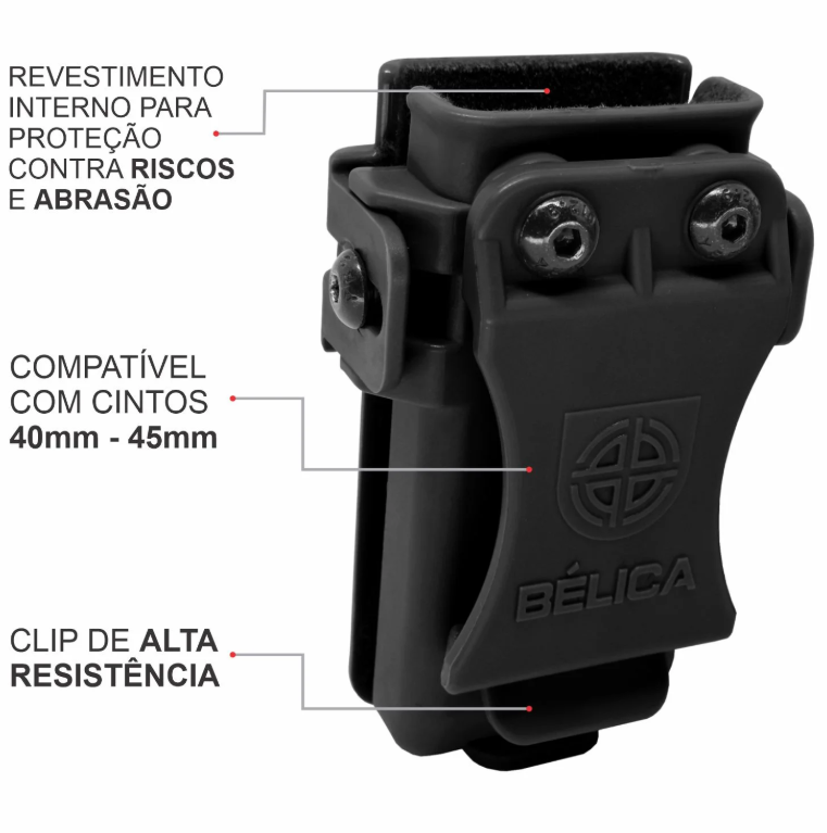 O Porta Carregador Universal Velado trás versatilidade com os ajustes de 3 pontos na pressão e encaixe dos carregadores .380, 9mm, .40 e .45 onde uma simples regulagem irá manter seu carregador seguro e preparado para ação com a proteção necessária feita pelo revestimento interno, protegendo o carregador contra risco e abrasão. Seu porte velado é seguro através do clip de alta resistência.